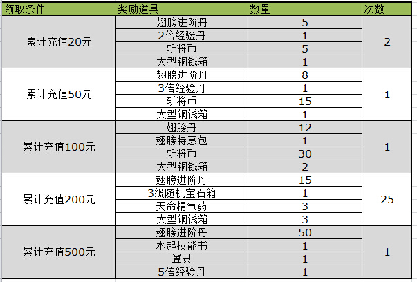 活动【充值送好礼-翅膀】开服第3天开启,持续1天,玩家只要累计充值达到一定额度即可获得丰厚的翅膀进阶道具奖励。