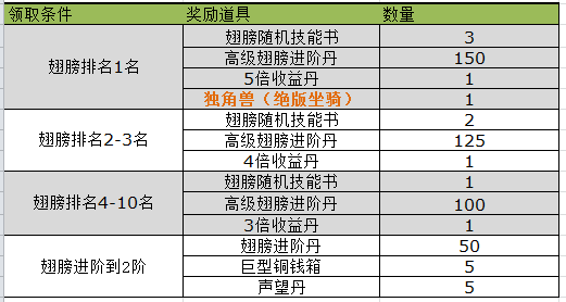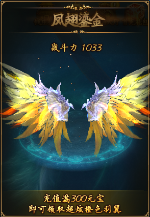 【翅膀进阶赢大礼】开服第三天开启,持续1天时间,活动截止时玩家达成翅膀进阶目标或者排名均会获得丰厚奖励返还。