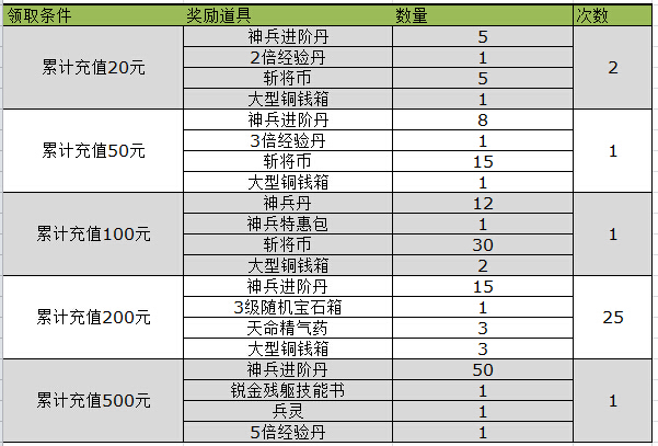 活动【充值送好礼-神兵】开服第4天开启,持续1天,玩家只要累计充值达到一定额度即可获得丰厚的神兵进阶道具奖励。