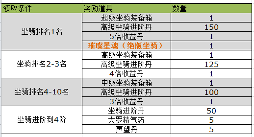 【坐骑进阶送好礼】开服第二天开启,持续1天时间,活动截止时玩家达成坐骑进阶目标或者排名均会获得丰厚奖励返还。