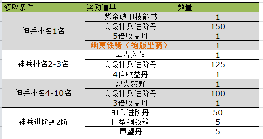 【神兵进阶赢大礼】开服第四天开启,持续1天时间,活动截止时玩家达成神兵进阶目标或者排名均会获得丰厚奖励返还。
