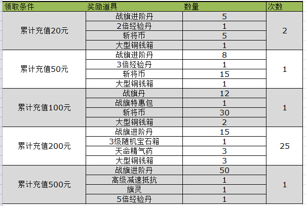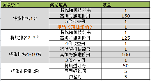 【将旗进阶赢大礼】开服第五天开启,持续1天时间,活动截止时玩家达成将旗进阶目标或者排名均会获得丰厚奖励返还。