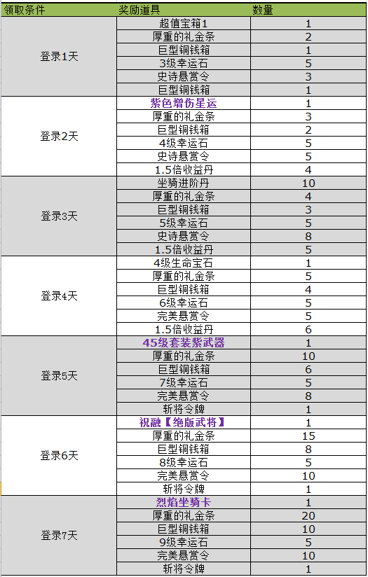 活动规则:开服1-7天内累计充值达到一定金额,绝版神装、高级宝石、星空龙坐骑卡、绝版橙将赵云,全都属于你!