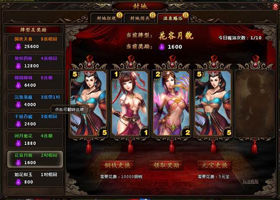 玩家每日初始赐浴次数为10,依据赐浴木牌的牌型可获得对应的奖励;如果玩家对某些木牌不满意时,也可以花费铜钱或元宝对不满意的木牌重新翻牌。