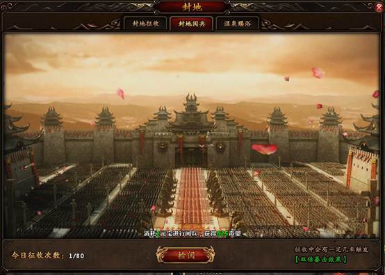 2. 封地阅兵,玩家可以花费一定的元宝,获得一定的声望,是玩家快速获得铜钱的一种方式,次数有上限。声望可用于武将培养。