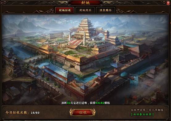 1. 封地征收,玩家可以花费一定的元宝,获得一定的铜钱,是玩家快速获得铜钱的一种方式,次数有上限。