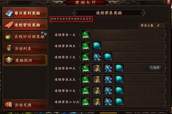 累计登陆游戏的玩家每天可以领取一份奖励,玩家登陆一旦有中断,前面的累计登录天数将会被清零重新累计。