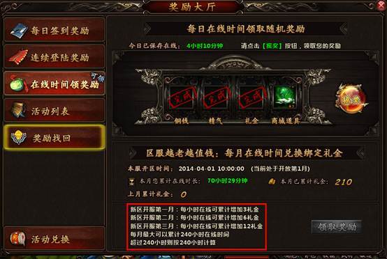 开服时间越久,玩家在游戏内每在线一小时可获得礼金越丰厚,最大可累计240小时的在线时间的礼金奖励,这些礼金可在下月领取。