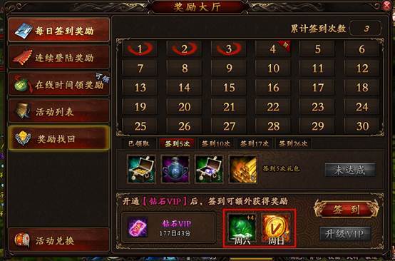 钻石VIP玩家可以进行补签操作,且在周六周日签到时可额外获得一份奖励。