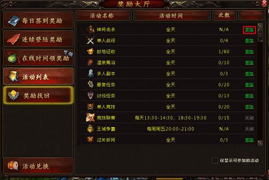 玩家可通过活动列表查看今日可参加的活动的相关信息,点击“参加”可打开对应的活动界面。