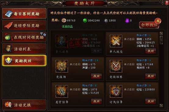 玩家可通过奖励找回功能花费铜钱或元宝,找回昨日未完成的活动奖励。