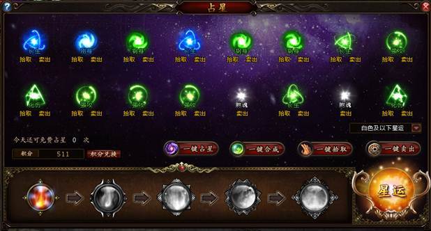 占星所获得的星运会列在界面上方,最低品质的星运无法拾取,只能出售。界面上方最多能容纳20个星运。