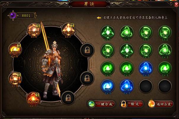 玩家可以通过点击占星球占卜来随机获得星运,占星球级别越高获得稀有星运的机率越大,每次占星均有一定机率开启更高一级的占星球,只有1级占星球为持续可点状态。
