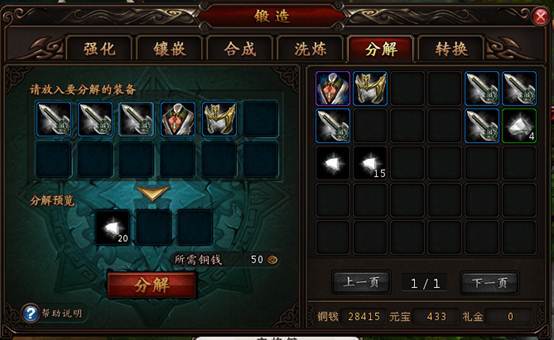 玩家可以将自己不用装备通过分解获得“洗练石”,“洗练石”可用于装备洗练以获得更好的属性。
