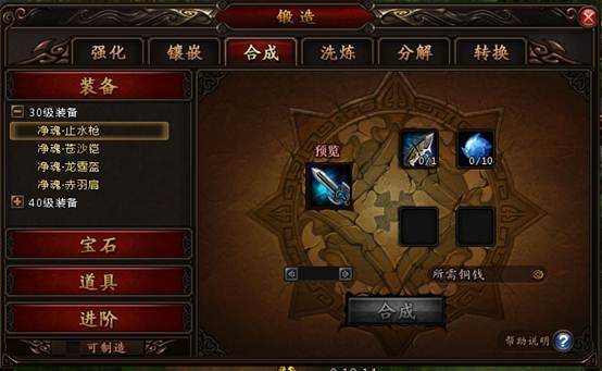 3) 道具:通过消耗低级的的幸运石、洗炼石以及青田石可合成获得高级的幸运石、洗炼石以及青田石。
