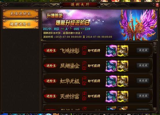 在活动期间内玩家可以领取对应进阶道具奖励,如果达到最高阶的话还可以获得永久提升坐骑/翅膀/神兵属性的商城道具。