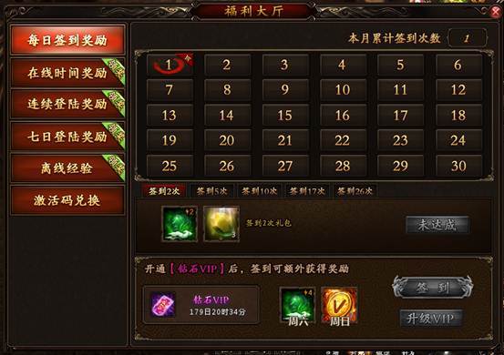 钻石VIP玩家可以进行补签操作,且在周六周日签到时可额外获得一份奖励。