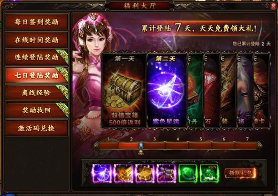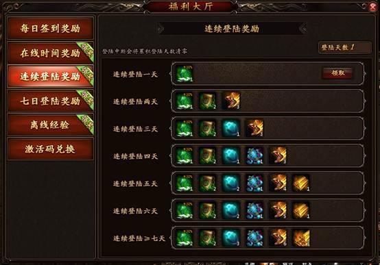 累计登陆游戏的玩家每天可以领取一份奖励,玩家登陆一旦有中断,前面的累计登录天数将会被清零重新累计。