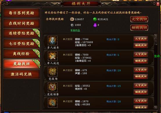 玩家可通过奖励找回功能花费铜钱或元宝,找回昨日未完成的活动奖励。