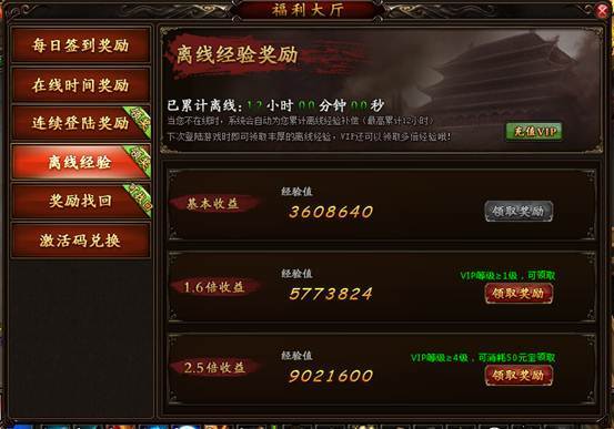 玩家下线后,系统会自动为您累计离线经验补偿,最多可累计12小时。同时VIP1及以上玩家可免费领取1.6倍离线经验,VIP4及以上玩家可花费少量元宝领取2.5倍的离线经验。