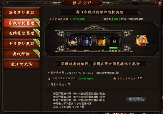 开服时间越久,玩家在游戏内每在线一小时可获得礼金越丰厚,最大可累计240小时的在线时间的礼金奖励,这些礼金可在下月领取。