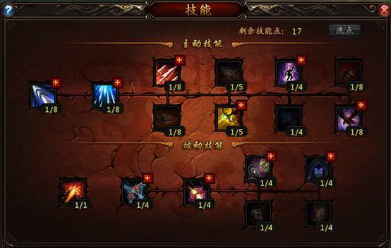 玩家升级的过程中会获得技能点数,可以用来升级职业技能。如图,K键打开技能面板,技能图标右上角显示有加号的,都可以点加号来投入1点技能点。